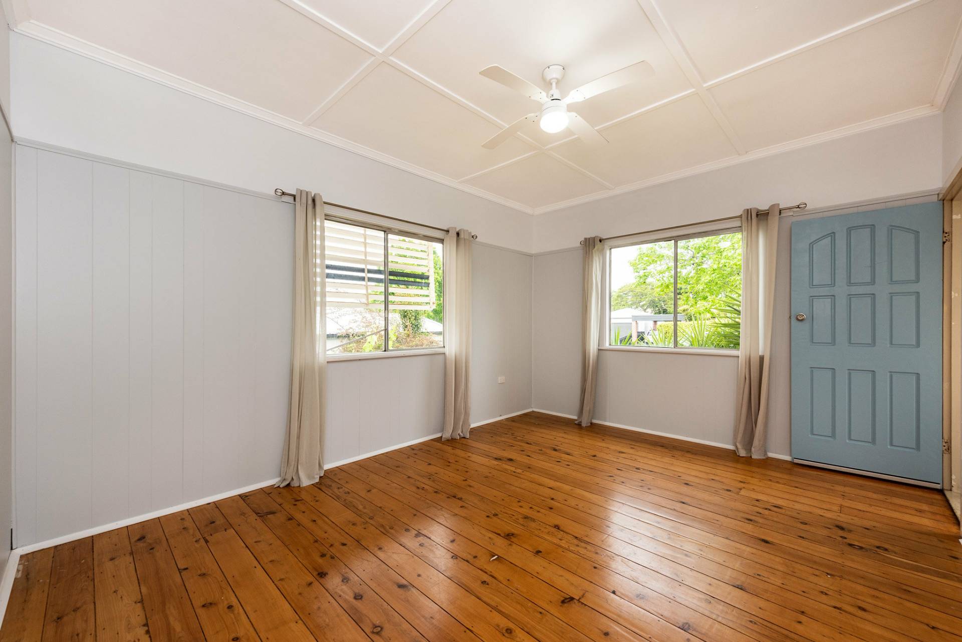 * Living room upon entry, polished timber floors & ceiling fan.