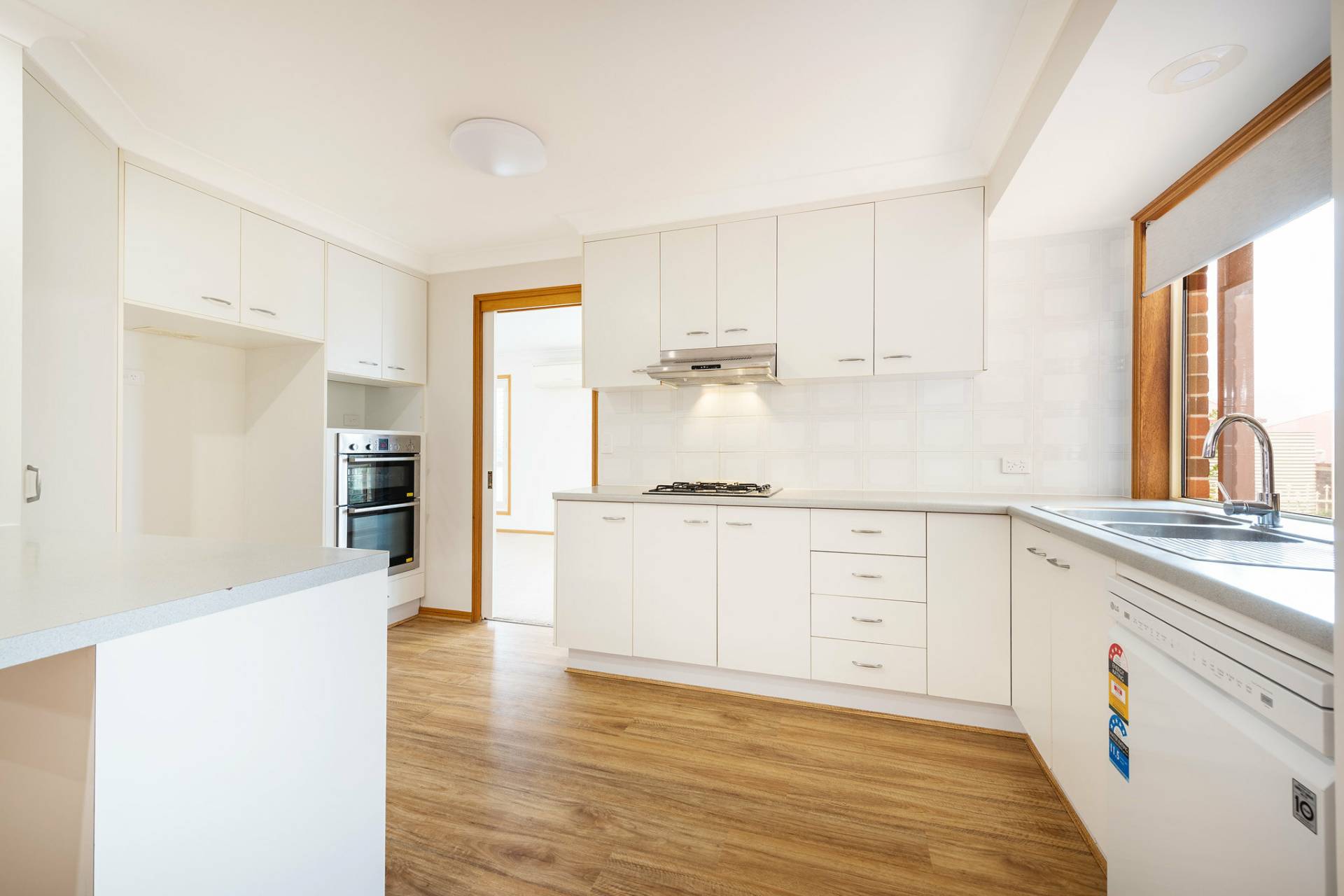 • Kitchen features double oven, gas cooktop & dishwasher.