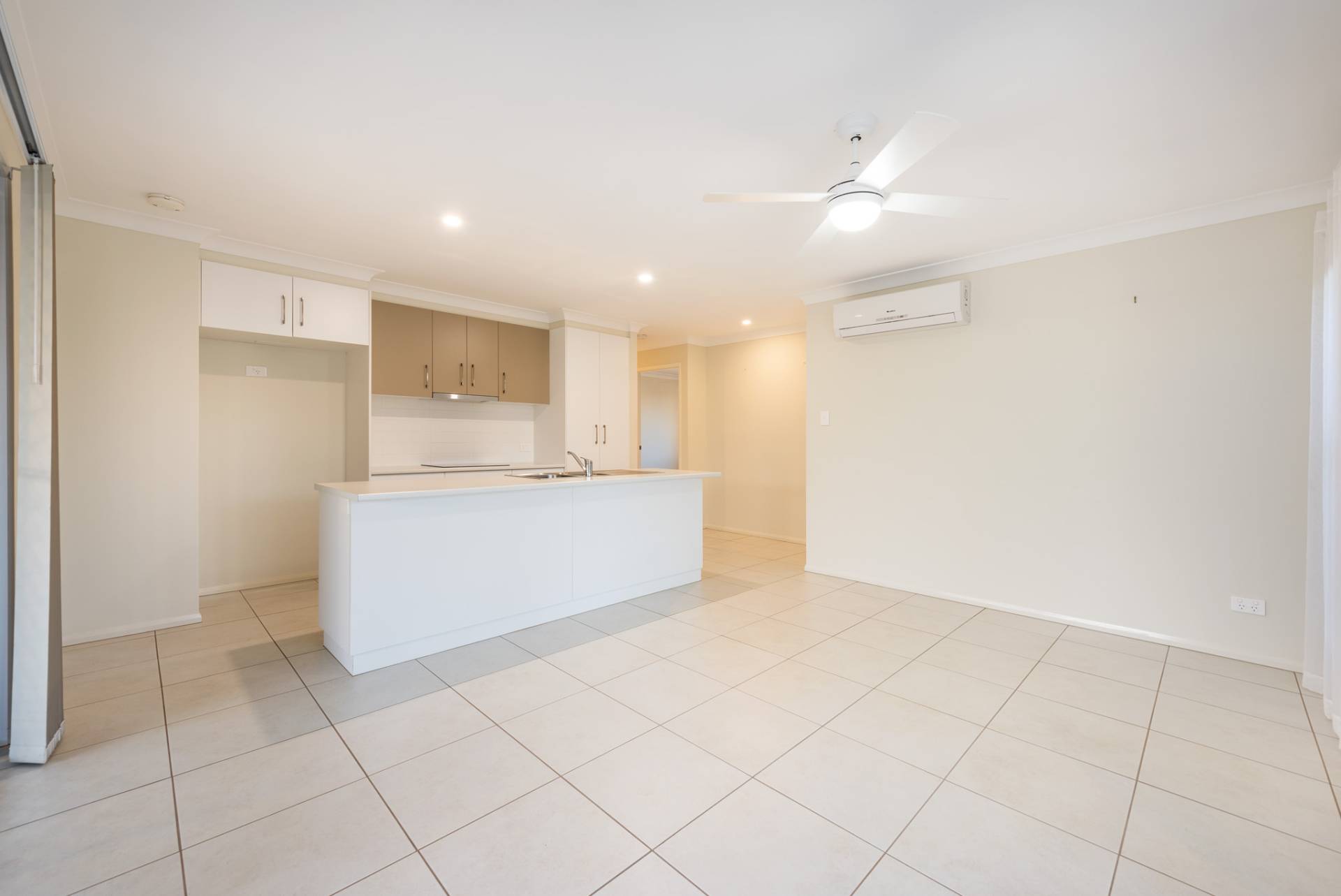 -Open plan dining and living area with ceiling fans and air conditioner