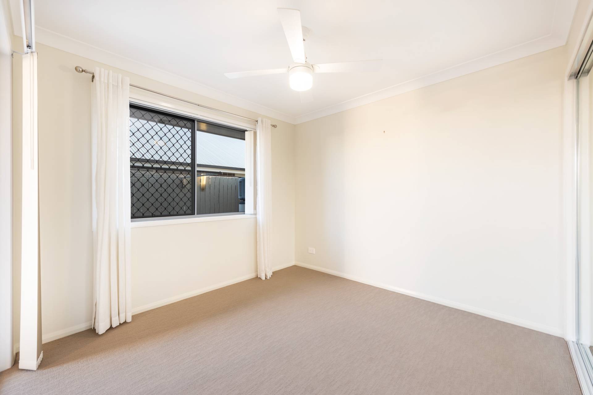 -Second bedroom with built-ins, ceiling fan and opens onto the patio area.