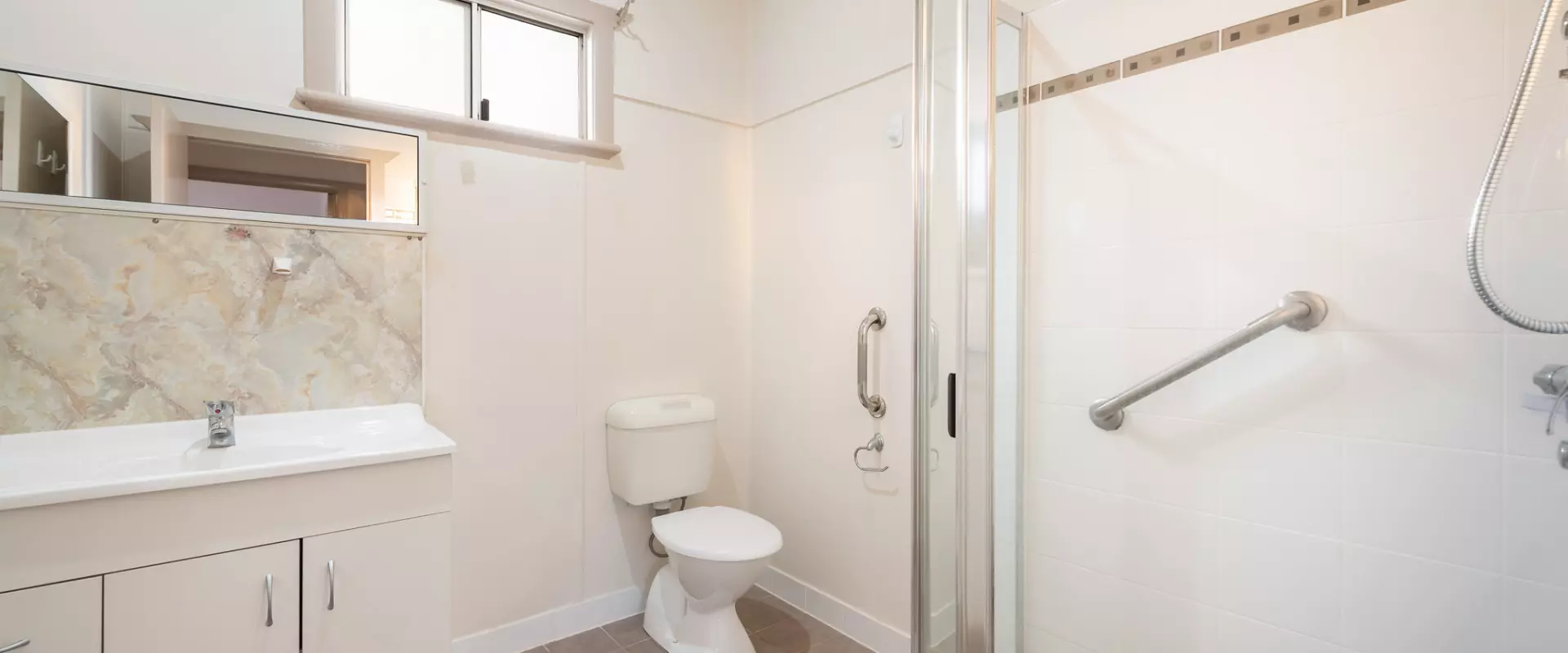 * Bathroom - large shower, vanity & toilet