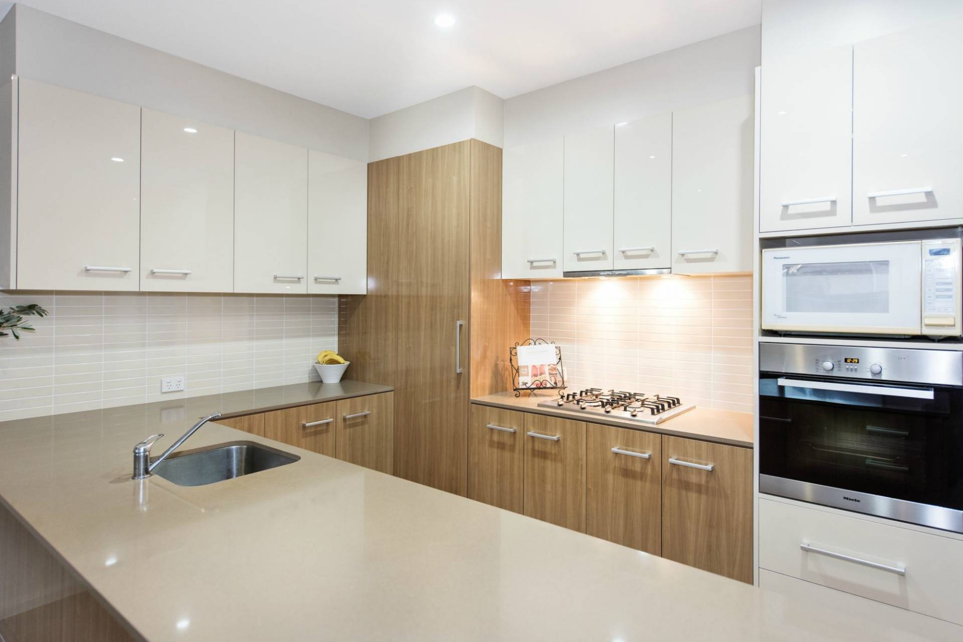 * Modern kitchen with Ceasarstone benchtops and Miele appliances - gas cooktop, electric oven and dishwasher