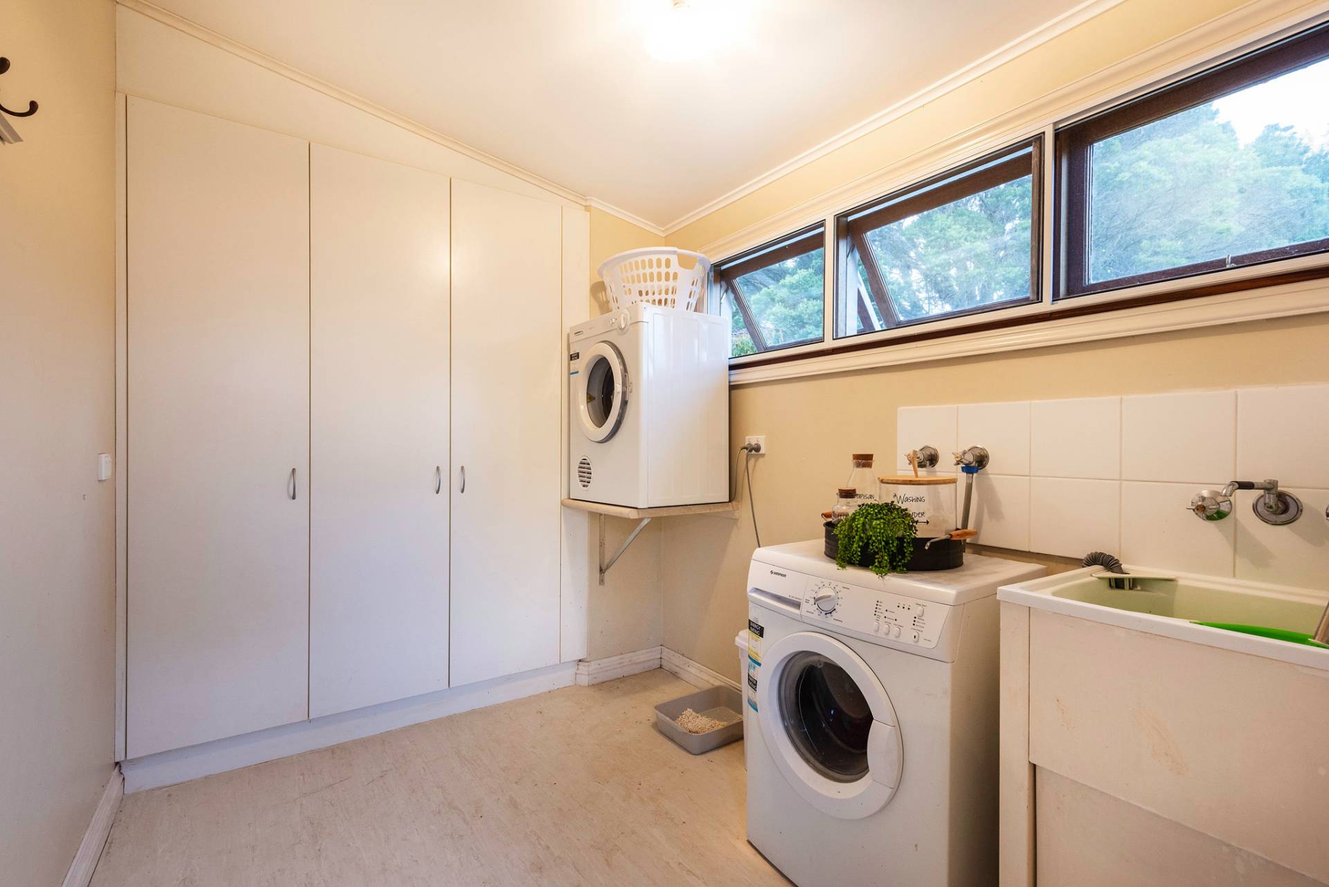 * Large laundry with wall of built-in cupboards.