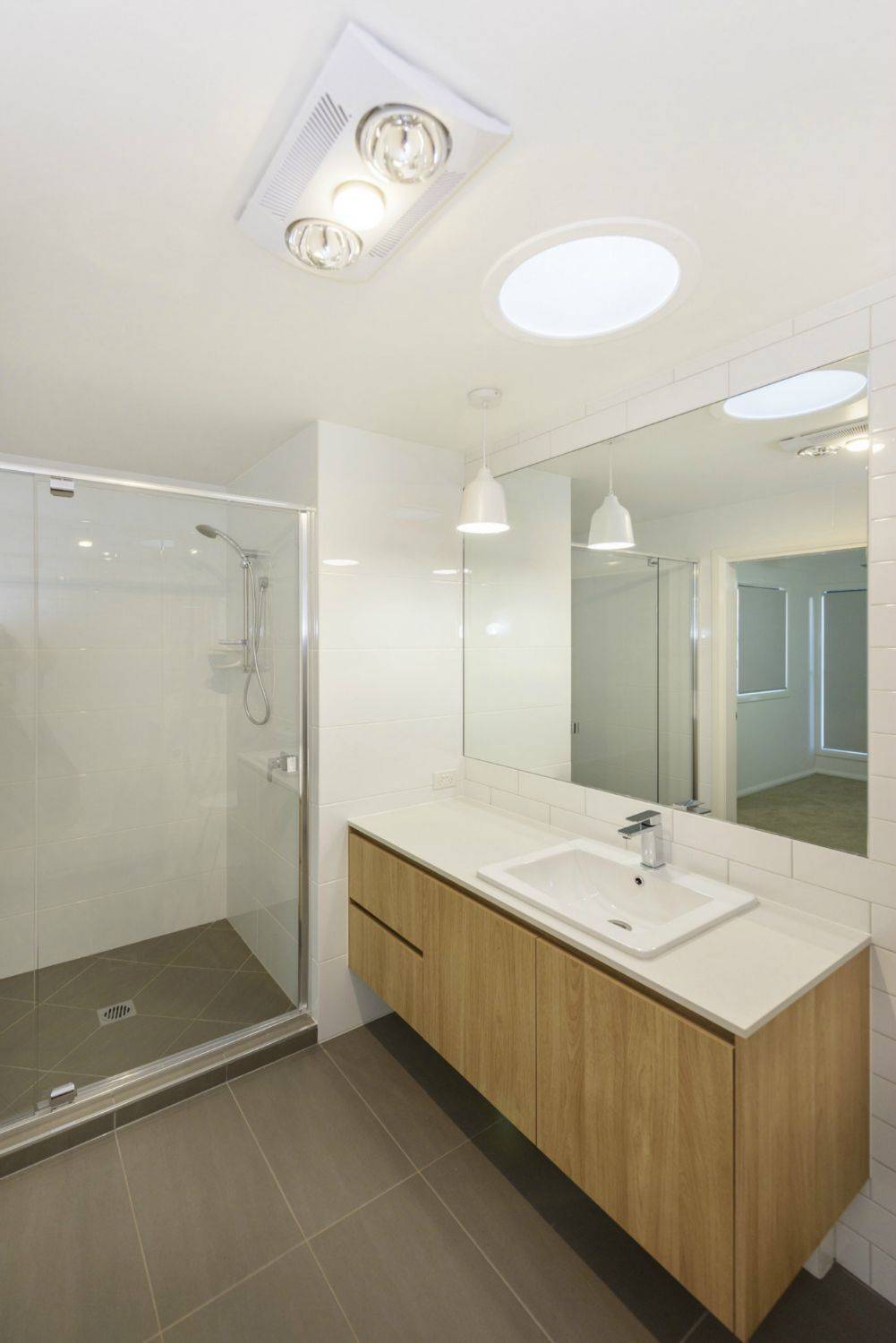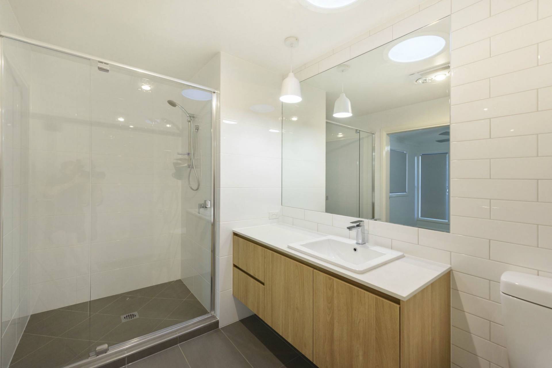 * Floor to ceiling tiles in bathrooms.