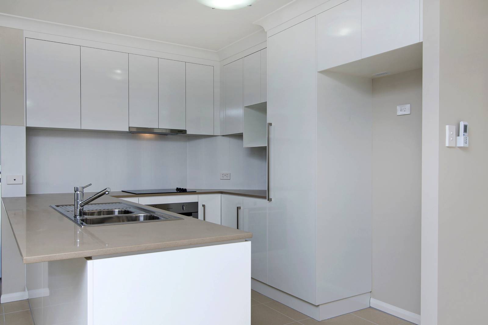 * Modern kitchen with stone bench tops and dishwasher.