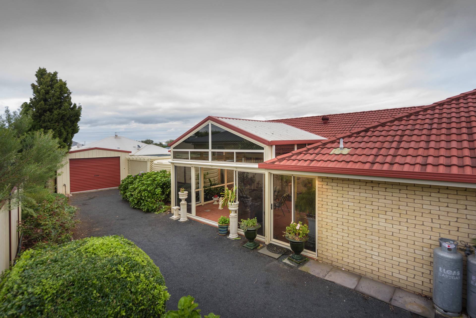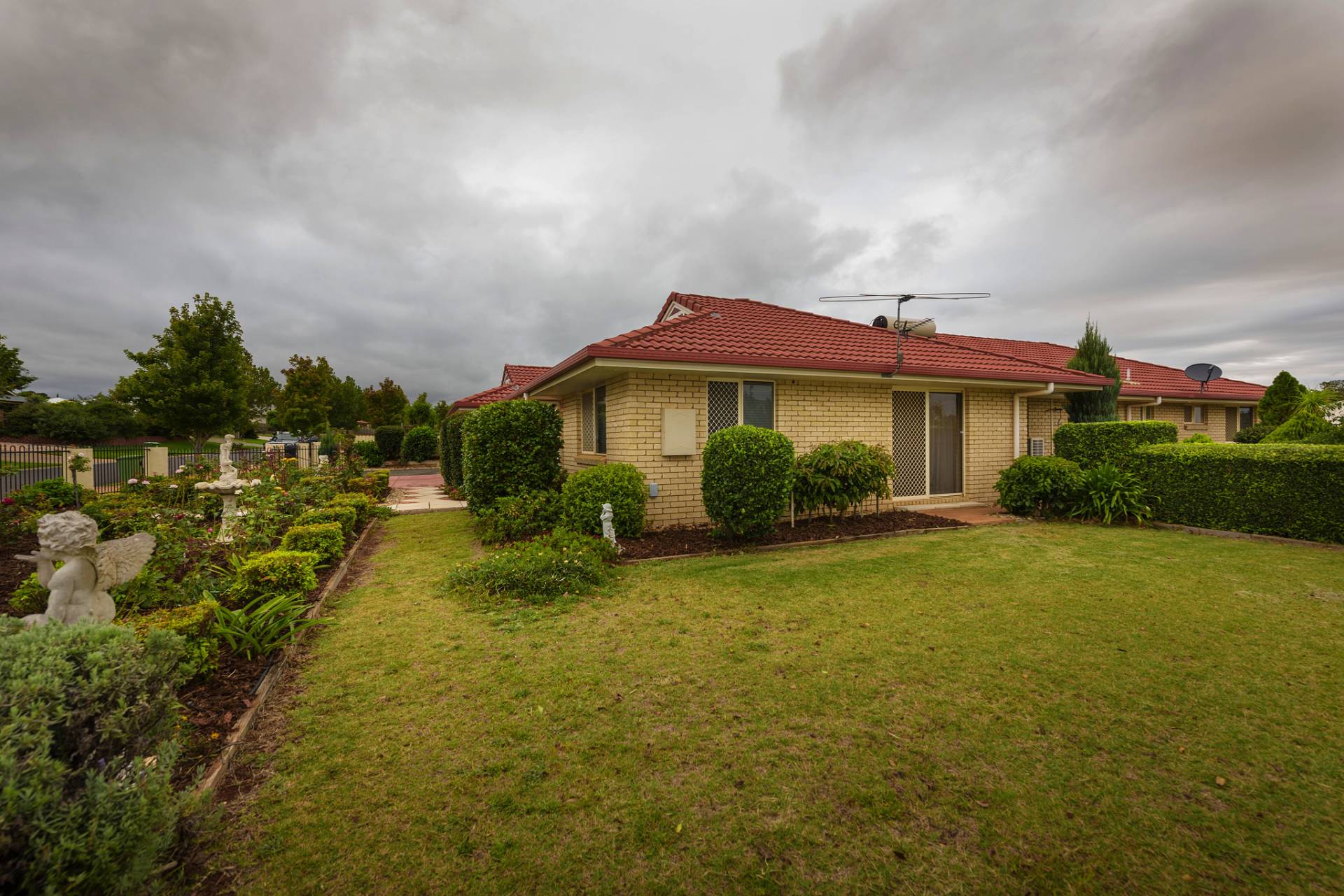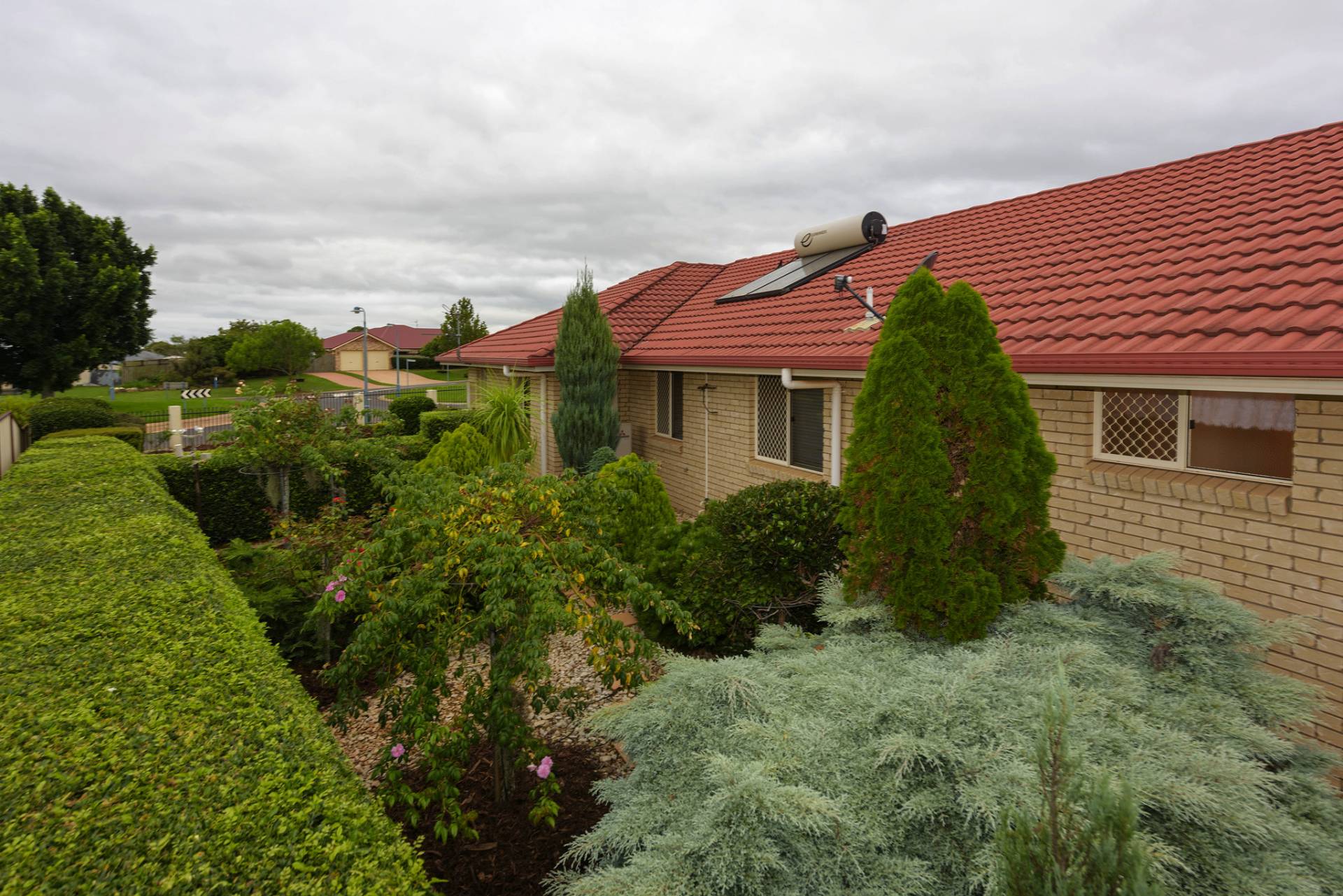 • Established & easy care gardens with built in water system. Mix of fruit, roses & conifers.