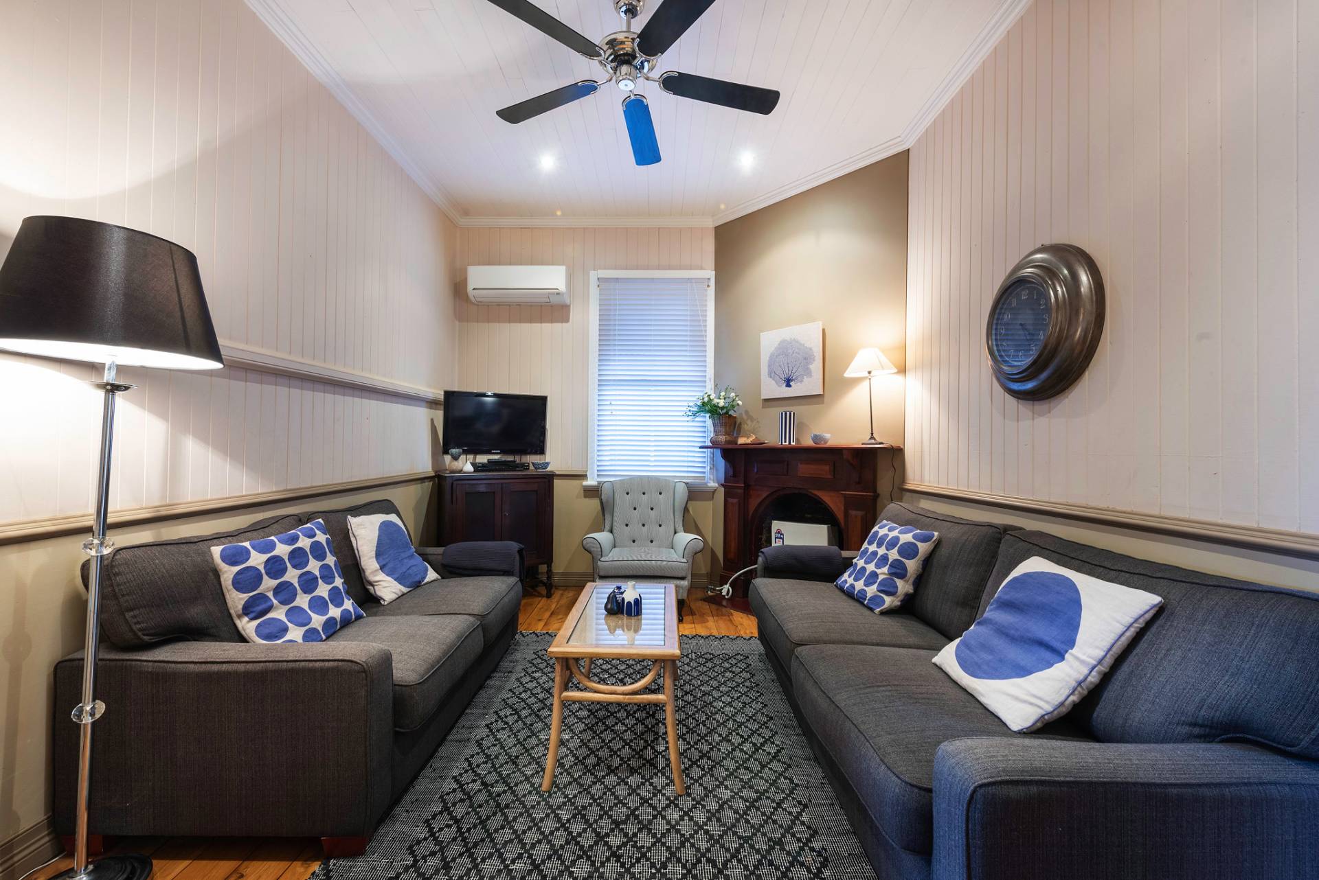• Timber floors. High ceilings. Fire place. Air-con.