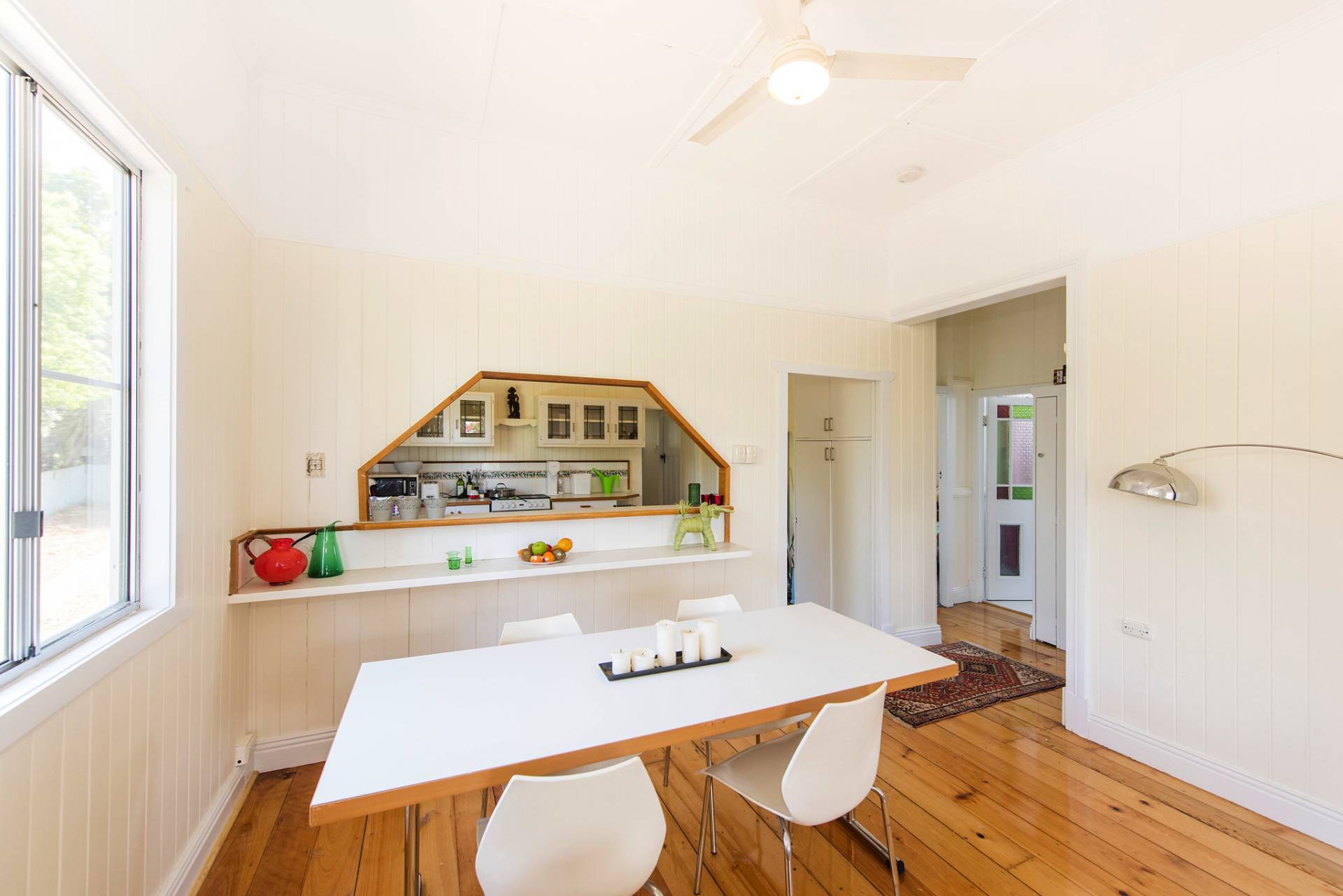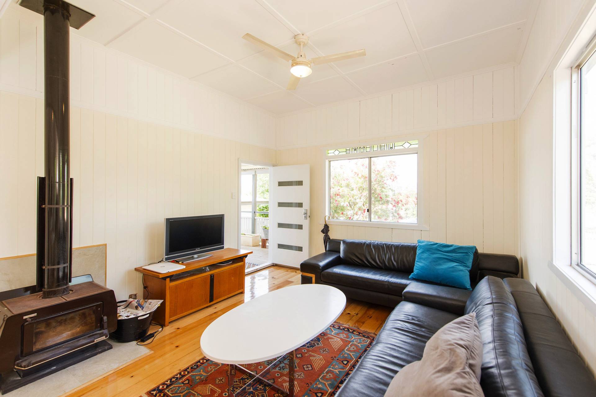 * Open plan living and dining area. Polished timber, Aircon + a fireplace.